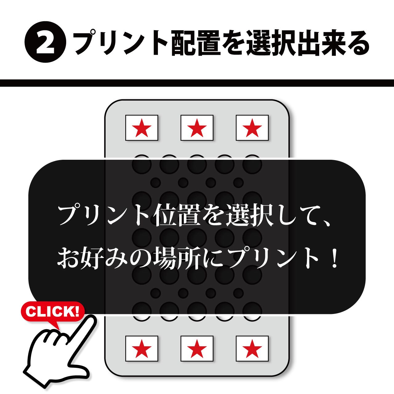 【完全オリジナルデザインプリント】では、印刷位置をお客様が自由に選択できます。[選択可能位置]・上部左側・上部中央・上部右側・下部左側・下部中央・下部右側(上記6カ所)デザインにあった、お好みの位置を選択ください。